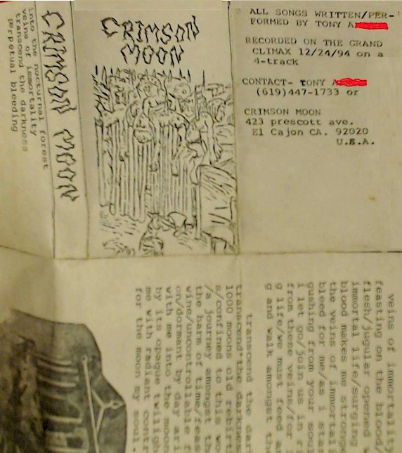 CRIMSON MOON is an occultic, melodic, black/death metal band which came into existence in 1994 with members Nocturnal Overlord, Scorpios, and Trommelnd Herr, all from the ashes of San Diego Death Metal band "Infested". After some short rehearsals Trommelnd Herr left the band for unknown personal reasons, and Crimson Moon continued on as a two piece. Shortly after, an un-rehearsed and limited recording was made in Dec '94 which later became known as the 1994 self titled demo. Only to be re-recorded and re-arranged in early 1995 with an extra track and released as the first official and widely distributed '95 demo "Into the Nocturnal Forest". From mid 1995 to early 1996, Overlord would write the majority of what was originally supposed to be the next demo. Meanwhile, Scorpios moved to Los Angeles, causing distance problems within CM. In 1996 this material was finally recorded and was later released in 1997 as the debut Crimson Moon CD "To Embrace the Vampyric Blood" on Abyss Productions.