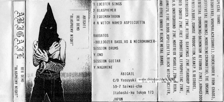 Abigail was formed in January of 1992 by Yasuyuki(Bass/Vocal),Youhei(Drums) and Yasunori(Guitar) being inspired by early black/thrash metal bands like BATHORY, VENOM, SODOM, BULLDOZER, HELLHAMMER, NME etc. Their first Demo was released in July of 1992 and in August of the same year they played their first gig with SIGH. In Feburuary of 1993, Youhei and Yasunori left the band. Nevertheless the second reh/Demo Blasphemy Night was released in March. In 1995 they released a PROMO for a few zines, labels and friends. No covers were made for this.