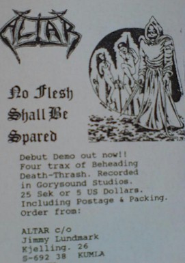 Altar was a death / thrash metal band from Sweden. They were previously known as Wortox but changed their name to Altar in 1990. They released a split album with the Finnish death metal band Cartilage in 1992. They split up around 1995