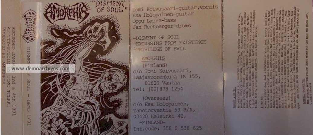 Lead guitarist Esa Holopainen and drummer Jan Rechberger formed the band Amorphis in Finland in 1990. To complete their lineup they recruited vocalist/guitarist Tomi Koivusaari from Abhorrence and bassist Olli-Pekka Laine. In January 1991, Amorphis spent two days in Timo Tolkki’s TTT Studio to record their first, and only, demo. The demo was so successful in getting attention for the group that they had acquired a record deal and released an EP the same year.