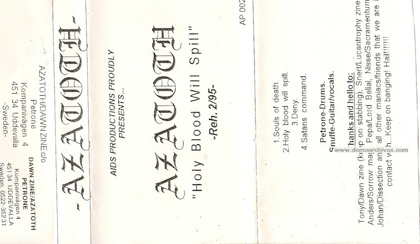 AZATOTH was a black/death band from Uddevalla, Sweden. They started in 94 under many different names and members. In 1995 they did 2 rehearsal demos as a duo. They split up sometime in 1996