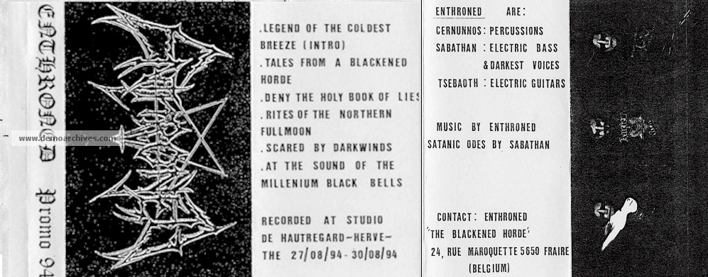 ENTHRONED was formed in 1993 by Cernunnos. He soon recruited guitarist Tsebaoth and later bassist/vocalist Sabathan. The band released a 5-track demo tape in mid 1994 which brought them to the attention of several independent labels. A 7” split EP with Ancient Rites was then released by the underground label Afterdark Records. After the label’s demise, Evil Omen Records (a sub-label of Osmose Productions) released ENTHRONED's first full-length release, Prophecies of Pagan Fire. They also released a ltd demo CD first only available for labels but afterwards released as a limited edition ( 50 only, 30 with Black & Red cover and 20 B/W) CD available exclusively at one gig (Bullion, France in 2000) this demo is the "P-2000" self-released Xeroxed booklet/ CD.