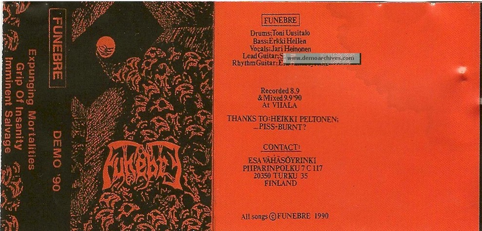 Funebre were a death metal band formed in Turku, Finland, in 1988. In that time two demos, the 1989 debut ‘Cranial Torment’, follow up Expunging Mortalities 1990 session and a 7” EP ‘Brainspoon’ were issued. The 1991 album ‘Children Of The Scorn’, released by Spinefarm Records, was produced by STRATOVARIUS guitarist Timo Tolkki.The FUNEBRE credited Seppo Kittilä would also operate as drummer for MONSTROSITY. Ex-FUNEBRE guitarist Samppa Haapio scored credits with INTERMENT.