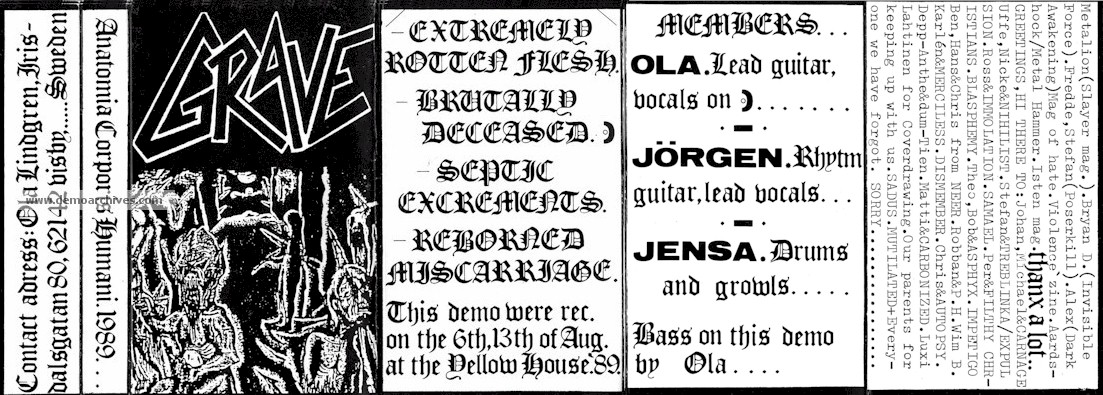 Visby's GRAVE are one of the founders of the Swedish Death / Doom Metal scene releasing their first demo, 'Sick Disgust Eternal', in August 1988 following a name change from CORPSE. The trio responsible for these tracks comprised Jörgen Sandström handling lead vocals, guitar and bass guitar, Ola Lindgren on guitar and drummer Jensâ Paulsson. The name switch to GRAVE was marked by the 'Sick Disgust Eternal' sessions. Parallel to this, Sandström, Lindgren and Paulsson, together with bass player Jonas Edwardsson, cut the 'Painful Death' demo credited to PUTREFACTION in 1989. However, these tracks would be sucked into the GRAVE catalogue. Two further demos, February 1989's 'Sexual Mutilation' and August 1989's 'Anatomia Corporis Humanum', recorded at Yellowhouse Studio, gained the band an enviable cult status. The latter demo was also to be issued as a four track EP by German imprint M.B.R Records. GRAVE had been snapped up by another German label, Century Media Records, and put out the full-length ‘Into The Grave’ album in August 1991.