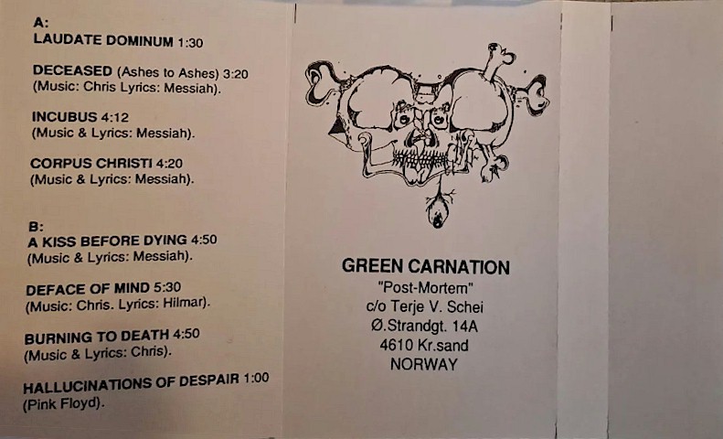 Kristiansand's GREEN CARNATION is a project band assembled by Tchort (Who would join EMPEROR and SATYRICON later on) , guitarist Christer C.H. Botteri and bassist X. Botteri of IN THE WOODS as well as personnel from DRAWN, CARPATHIAN FOREST along with TRISTANIA's Vibeke Stene. The band was actually a 1998 reformation of sorts, the original GREEN CARNATION having morphed into IN THE WOODS when Tchort took up arms with EMPEROR and singer Richart Olsen exited in 1992. Operating in Death Metal territory the original variant of the band had issued just the one demo 'Hallucinations Of Despair'. The group, with Alf Tore Rasmussen newly installed on drums, was re-assembled in November 1998.