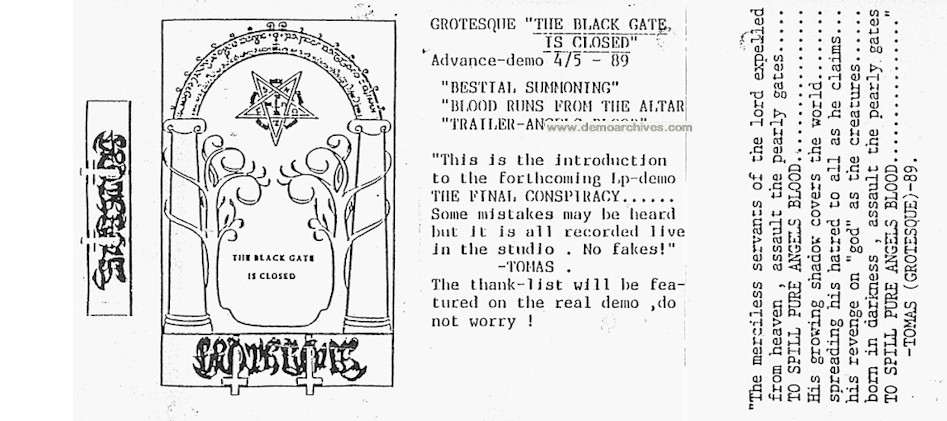 Grotesque was spawned out of the abyss in September 1988 rising from the ashes of death/thrash/metal band Conquest, a band first formed in early -86 by guitarist & songwriter Necrolord. Howsoever, this band didn't become totally twisted, insane and serious until unholy screamer Goatspell joined in March -88. When Grotesque hit the local scene in the fall of -88 there were absolutely no other death metal bands around in the Gothenburg area and there were literally just a few people into underground death metal. Grotesque soon got a maniacal reputation of being devoted satanists, grave desecrators, blasphemers and a very brutal live band. The original line-up featured Goatspell - vomits, Necrolord - high priest of distortion and Nuctemeron - 4-string damnation as well as two other members who soon left due to wimpdom. In the early months of -89 the drummer Offensor joined the order of blasphemy and desecration thus completing the Grotesque line-up. On the 4th of May they recorded the blasphemous rehearsal/demo "The Black Gate Is Closed" an avalanche of death and hate preparing the wimps for Grotesque's first studio recording. The coming months were spent writing new songs like the epic "Angels Blood" and "Submit To Death" as well as playing a few crazy and brutal live shows. The legendary November recording of "In The Embrace Of Evil" featured five songs - this was originally meant to be the first five songs of a full length album on Dolores Records, another three tracks to be recorded later on. Therefore, the recording was never released as a demo. In late -89 Nuctemeron left the band. This set-back did not hinder the unholy making of new, faster and more technical evil songs - "Nocturnal Blasphemies", "Spawn Of Azathoth", "Church Of The Pentagram", "Ritual Mutilation" and the legendary "Incantation". These new songs fully stated that Grotesque never compromised one way or the other... They had only gotten blacker, more evil and intense. Renowned tattoo artist and guitarist "The Haunting" had joined the band in the beginning of the year, bringing in a new dimension of brutality into Grotesque. In August 1990 Grotesque did the "Incantation" recording (3 songs for the Dolores Records mini album).