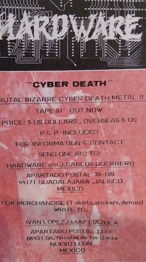 Born in 1991 in Guadalajara, Jal. Mexico, The members came from bands like BRUTAL, DRAKSEN, EXTINCION CEREBRAL, PENTAGRAM and APOSTOL DEAD. " The original line up was "Juan Carlos Guerrero(vocals), Luis Ahumada (guitar/keyboards), Ernesto Catalan( drums), Jorge Ruiz (guitar), Rodolfo Cuevas(bass) and Manuel Reveles(drums). The music was very unique, a combination of death metal, grindcore, industrial, pre-hispanic instruments and the use of keyboards without sounding melodic or gothic. The keyboards gave the music some kind of eerie feeling. In 1991 the band released their first demo "cyber death" which sounded very decent for a demo back in the day. Thanks to the tape trading network back in the early 90's, it gave the band the chance to spread their music all over Mexico and many countries around the world. They played shows all over Mexico. In 1992 the band released their 7' ep "souls vortex", four new songs in the same vein as the demo "cyber death". The 7" ep was released by the label Insmouth Records