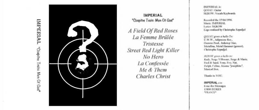 Imperial is a french Metal band formed in 1992 by Qojau and Skrow. The band starts to play primitive Death/Thrash-Metal songs. In 1993, Julien quits the band. Qojau and Skrow continue to make songs in duo and choose IMPERIAL for band name. Skrow stops to play drums for guitar and starts to sing on songs. The drums parts are played by a drum machine "The Boss". In 1994, IMPERIAL duo makes 3 concerts and records 5 tracks for the first demo tape "War Spirit". The musical style sounds more extreme and original, and the band uses more Black-Metal influences. Now Skrow makes all vocal performances. In 1995, IMPERIAL record 6 new songs for their second demo tape "The Red Moon" + a new edition of the "War Spirit" demo. The band has now his own musical style, still influenced by all extreme and primitive Metal scene. Skrow starts to write and sing lyrics in french ("Lumière Noire" is the first IMPERIAL song in french), and plays bass on rehearsals. In 1996, IMPERIAL record their third demo tape "Chapitre Trois : Men Of God". The 8 songs are more technical, 3 songs are singing in french and Skrow plays keyboards parts during all the session. The demo comes the favorite tape of IMPERIAL maniacs. In 1997 the band decides to record 5 new songs in studio for making a promotional tape destined to labels. These 5 songs are all singing in French. Osmose Productions sign IMPERIAL for 2 albums and 1 MCD. The first album "Aux Crépuscules" is recording in 1997, still by the duo Qojau (guitar/drums programming) and Skrow (vocals/bass), and out in 1998. The 5 songs of the "Promo Tape '97" are include on the album.