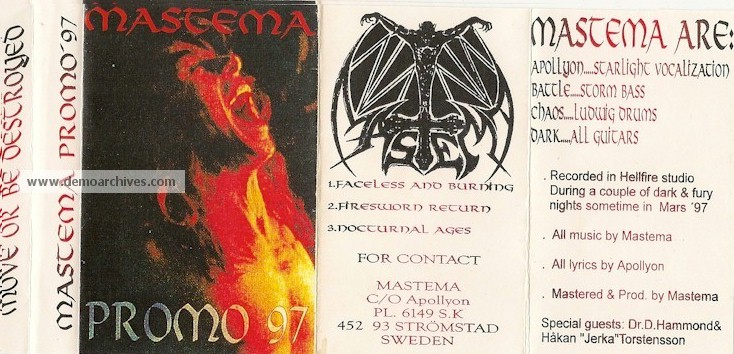 Mastema was born from the ashes of Malicious Decay back in 1992. Malicious Decay split up about a month after recording the demo”Unholy Crusade”. In the beginning the line up of Mastema was Grim, Battle and Apollyon. Today Apollyon is the only original member of the band since the beginning back in 92’. After about a year of hard work in 93’ the trio entered studio TBV to record their first demo ”Mefistofeles”. In the mid 90’s Mastema moved from their home town Strömstad to a bigger city. Uddevalla was now the base for Apollyon and battle. Since their was some distance between Strömstad and Uddevalla the last page was written for Grim in the Mastema history. In Uddevalla Apollyon and Battle were rehearsing with more or less successful constellations. As time went on and they tried some guitarists only one man was good enough, Thomas”Dark” Backelin. He was now the new guitarist of Mastema and once again the band was a strong trio. Some time after Dark joined the band Chaos came along to take over the drumming so that Apollyon could focus only on being the singer of the band. During the years 97’ and 98’ Mastema recorded two promo cd’s and both of them received very good response in the underground. Now it was time for the next man to leave the band. Battle had to move to Gothenburg and because of his condition of living he could not proceed with the band. Battle was replaced with a bassist named Anders who also was active in the band ”Grief of Emerald”.