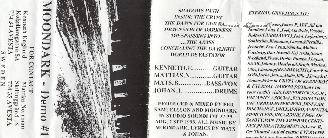 Moondark was formed on a cold and dark winter evening in the beginning of 1993 by Johan Jansson and Kennet Englund when they rehearsed covers of Crypt Of Kerberos, Eternal Darkness, and Bolt Thrower etc... In the birth Johan played guitar because he did most of the music in Moondark and Kennet played drums. Then Mattias Norrman (Katatonia, Subdive, ex Dellamorte) joined on guitar and after a while Johan and Kennet switched instruments. Moondark decided to record a demo in Soundline Studios in Avesta later same year and asked Mats "Mabbe" Berggren (ex Fulmination) to join on bass and vocals. They recorded 7 songs and was engineered & mixed by Per Samuelsson and Moondark. The demo was simply named Demo1 and it was meant to be sent to labels for a record deal but that didn’t happen because of laziness. Moondark recorded a  full-length album entitled "The Shadowpath"  in 1993 but never released until 2007. Eventually changed their name to Dellamorte.