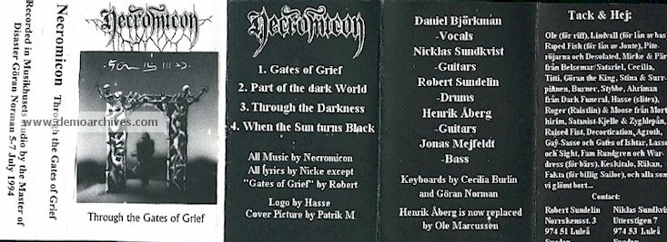 In early 1993 Niklas Sundqvist, Robert Sundelin and Henrik Åberg formed the band Leprechaun with the intention of making dark, violent music. Vocalist Daniel Björkman was soon added to the line-up. Leprechaun played a couple of gigs before changing their name to Necromicon. In January 1994 the first demo 'When the Sun turns Black' was recorded. This demo wasn't spread widely at the time of its release but received some good and average reviews in the underground. The second demo 'Through the Gates of Grief', recorded in July '94, featured a new bassplayer, Jonas Mejfeldt. This tape made Necromicon a more or less well-known band in the underground. Soon after the recording Henrik left the band. Jonas moved on to play guitar and Niklas' younger brother Patrik filled in on bass. Also a keyboardist, Roger Johansson, was recruited at this time, as the keyboards were becoming a more important part in Necromicon's music. In early '95 a deal for a split-cd was signed with the new French label Impure Creations Records (now known as Velvet Music International). At this time Jonas was forced to leave the band, as he was becoming a father. The remaining members recorded five songs for this release in February of '95, but as the contract was altered later in the year, three additional songs were recorded in August. These tracks featured a new guitarist, Stefan Lundgren. The eight songs became the 'Realm of Silence' album, which was released in April '96. The band eventually split and from the ashes of Necromicon the new band Cimmerian Dome has sprung.