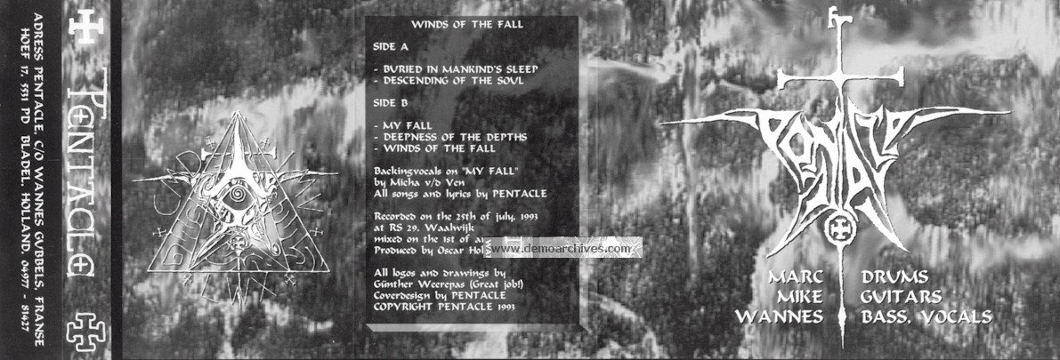 Chained within the mythical realms of primeval black/death metal, so graciously unveiled in the early 80's by hallowed cults such as Venom, Hellhammer, Celtic Frost, Possessed, Messiah, Destruction, Necrovore, Bathory, Treblinka, Slaughter (CAN) and Necrophagia, Pentacle's sepul­chral tribute, to this unforgotten legacy, started back in winter '89/'90 when Mike (guitar), Wannes (bass/vocals) and Marc (drums) joined forces...Entangled in the growing urge to inspire their own roaring metal quest, Pentacle soon developed a highly ambitious con­spiracy; forging twisting death metal rhythms and haunting doom chords in the archaic traditions of the crafts. 1992 spewed forth Pentacle's first official rehearsal tape, "Caressed by Both Sides"; a primal anthology of pounding horror, which contained 4 of their own compositions as well as the band's gloomy interpretation of Hellhammer's "The Reaper". Shortly after the tape's release, Pentacle gained stage expe­rience supporting bands such as Asphyx and Gorefest. The heretical spawn crawled on into 1993 with the trinity's one and only studio demo, "Winds of the Fall", which unleashed 5 more charnel hymns to conquer souls enslaved by ancient metal. Their earthly testimony of doom was reflected in prai­sing reviews and encouraging respect from kindred bands. More stages were shared with the likes of Occult, Anathema, Senten­ced, Ancient Rites, Acrostichon, Eternal Solstice and Samael...1994 witnessed Pentacle descending into the recording dungeons once more, to evoke "A Dance Beyond"; exclusively destined to be included on the DSFA 6/"Paradise of the Underground" compilation CD, for the Dutch based DSFA label. Pentacle's first vinyl desecration "Exalted Journey", emerged a few mooncycles later; from the Belgian Midian Creations; a 2 track 7" EP to spread the ceremonial onslaught even further. In March/April 1996, Pentacle's ranks of the depraved were joined by axewielder Edwin, to create an even heavier and deadlier storm of slashing metal scythes, as the 12 " Picture Disc/ CD, "The Fifth Moon", proves.