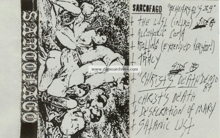 Xeroxed covers. Regular Tapes. Also known as the INRI or Christs Death demo. First of two versions. Usually comes w/ a title insert and the backs of the cover are stamped w/ their band address