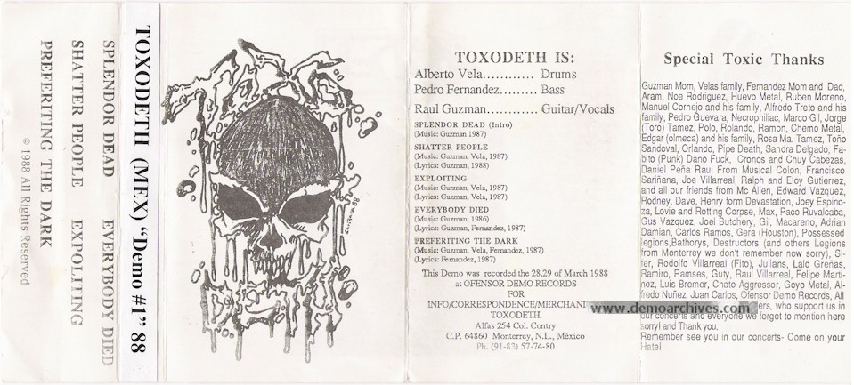 Toxodeth was born in December 1984 in Monterrey, NL (North Mexico) of the Guzman brothers Raul (Guitars & Bass) and Jesus (Vocals & Bass) and several other drummers and bass players, Ricardo Vilchez (Bass), Marco Gil (Bass & Drums), Alberto Vela (Drums) and many others just to name a few. An eponymous demo surfaced in 1987 followed by a further cassette, 'Phantasms', in 1988. TOXODETH gained their debut CD release in 1989 when Semaphore Recordings issued 'Mysteries About Life And Death'.