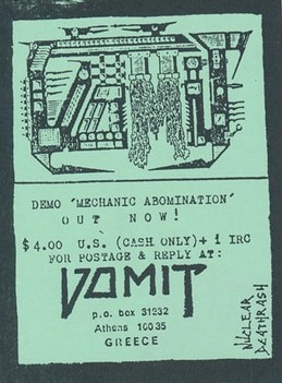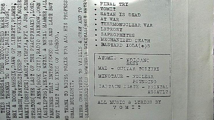 Formed in 1985. VOMIT were strongly influenced by VOIVOD and CELTIC FROST. Just look at the VOMIT logo. It is straight off of the VOIVOD design. And the music is considered by today's standards, black metal. But back in '88 this demo would have been seen as speed/ thrash with no direction or vision. Members later split into VARATHRON and NECROMANTIA. The vocalist went on to form the grindcore band SOUND POLLUTION who did a split record in 1989 with ROTTING CHRIST, who were also a grindcore band at the time. Captain Death (Spyros) also was the drummer for VARATHRON on their first demo in 1989! At that time, VARATHRON were a death metal band. The members of VOMIT had also a 'zine called "THRASH METAL".