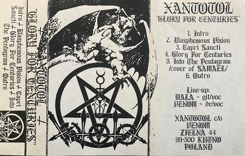 Kutno based Black Metal band XANTOTOL, featuring frontman Mala of HIARA and KAYZEN, released the demo tapes 'Glory For Centuries' in 1992, 'Cult Of The Black Pentagram' in 1993 and the May 1995 set 'Thus Spake Zaratustra', the latter seeing commercial distribution via Witching Hour Productions. XANTOTOL also included bassist Siwy and drummer Jacek 'Venom' Szczepanski.